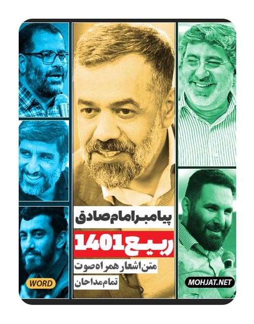 دانلود بستهی متن اشعار مولودی ولادت پیامبر و امام صادق ۱۴۰۱ همه مداحان شامل حاج محمدرضا بذری, حاج مهدی رسولی, حاج مهدی سلحشور, حاج محمدرضا طاهری, کربلایی حسین طاهری کربلایی محمدحسین حدادیان و حاج محمود کریمی همراه دانلود فایلهای صوتی به صورت یکجا در قالب فایل زیپ. مجموعهای بی نظیر از شعر و سبکهای اجرا شده. تایپ و انتشار اختصاصی از فروشگاه اینترنتی مهجه. برای مشاهده جدیدترین آثار به صفحه اصلی مراجعه کنید.